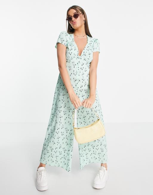 ASOS DESIGN - Nette jumpsuit van bubble crêpe met kapmouwtjes en knoopsluiting aan de voorkant in fijne saliegroene print