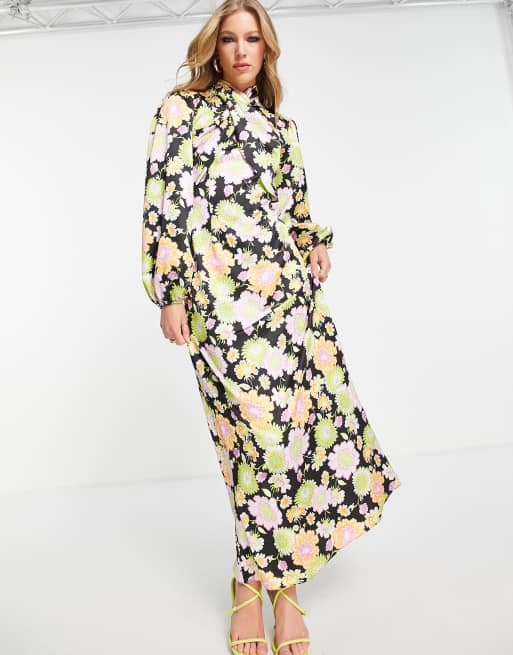 ASOS DESIGN - Nette maxi jurk van satijn met overslag aan de voorkant in felle jaren 70 bloemenprint