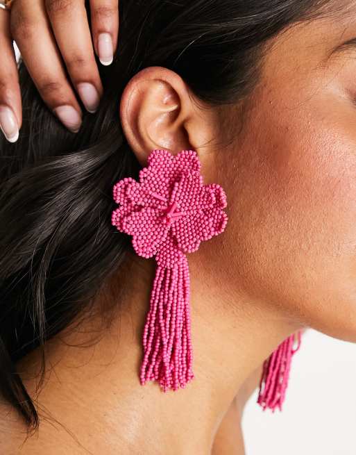 ASOS DESIGN - Oorhangers met bloemmotief met kralen in felroze