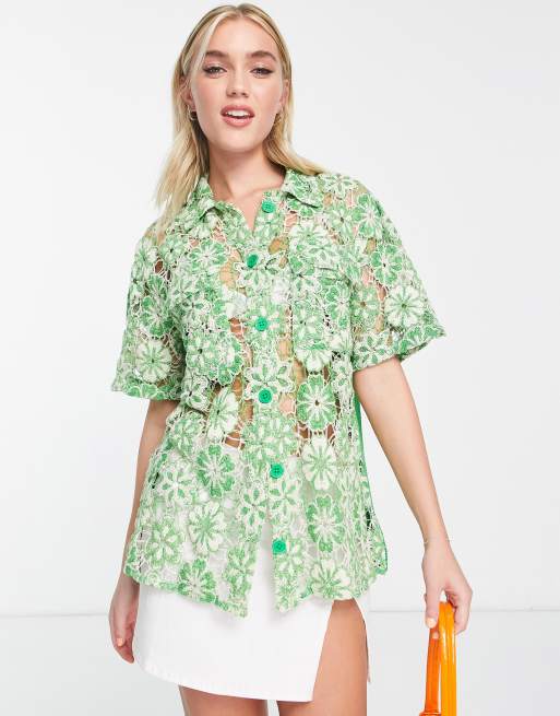 ASOS DESIGN - Overhemd met korte mouwen en gehaakte bloemen in groen