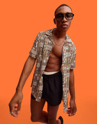 ASOS DESIGN - Overhemd met reverskraag en aztekenprint in bruin