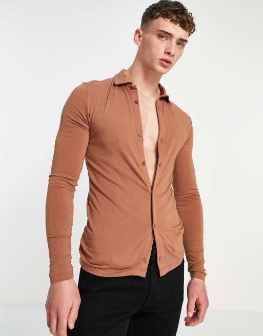 ASOS DESIGN - Overhemd van jersey met lange mouwen en knoopsluiting in bruin - BROWN