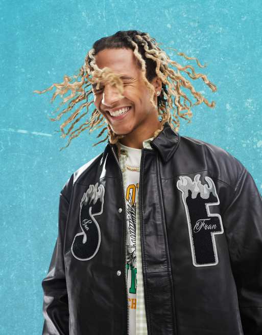 ASOS DESIGN - Oversized bomberjack van echt leer in collegestijl in zwart