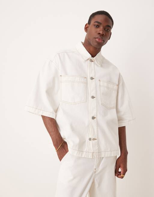 ASOS DESIGN - Oversized denim overhemd met korte mouwen en opgestikte zakken in ecru, deel van co-ord set