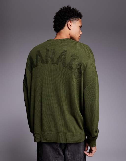 ASOS DESIGN - Oversized gebreide trui met ronde hals en Marais-borduursel op de achterkant in kaki