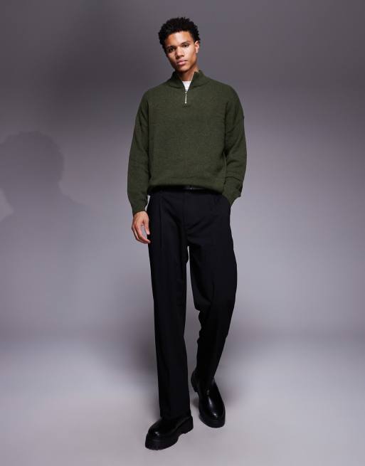 ASOS DESIGN - Oversized gebreide trui van lamswol met korte rits in gemêleerd kaki
