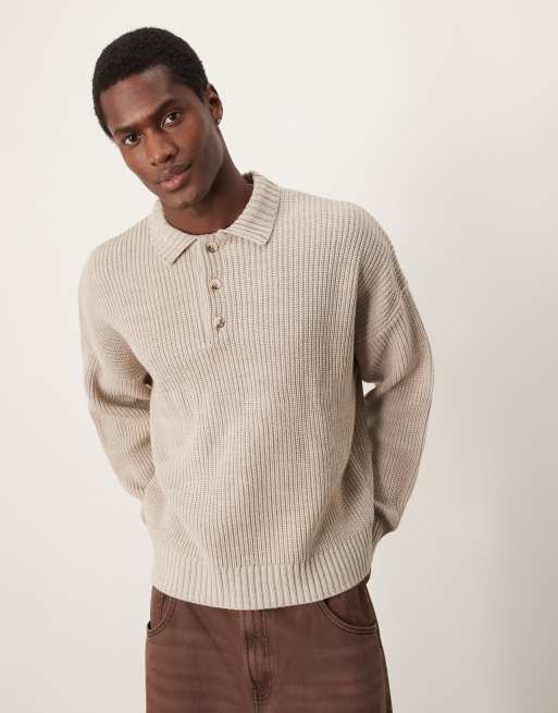 ASOS DESIGN - Oversized gebreide visserstrui met rechte pasvorm, ribbels en polokraag in beige
