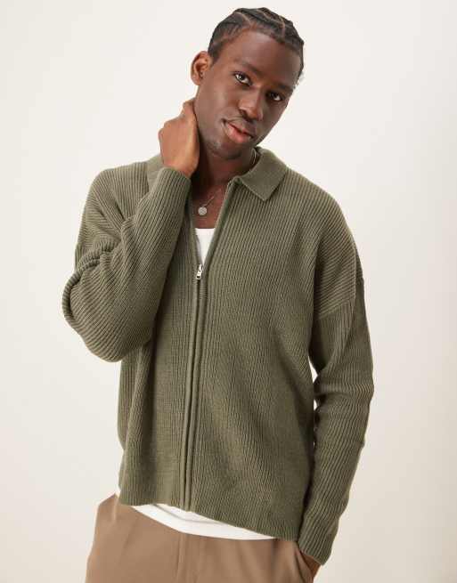 ASOS DESIGN - Oversized geribbeld gebreid vest met ritssluiting en kraag in kaki