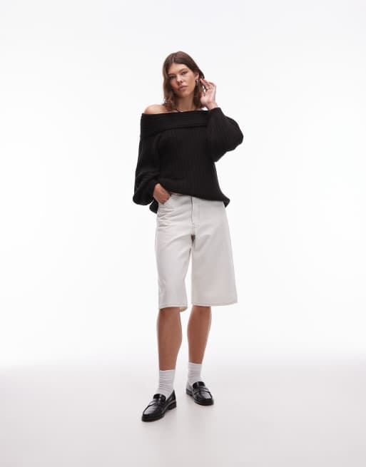 ASOS DESIGN - Oversized geribbelde gebreide trui met blote schouders en ballonmouwen in zwart