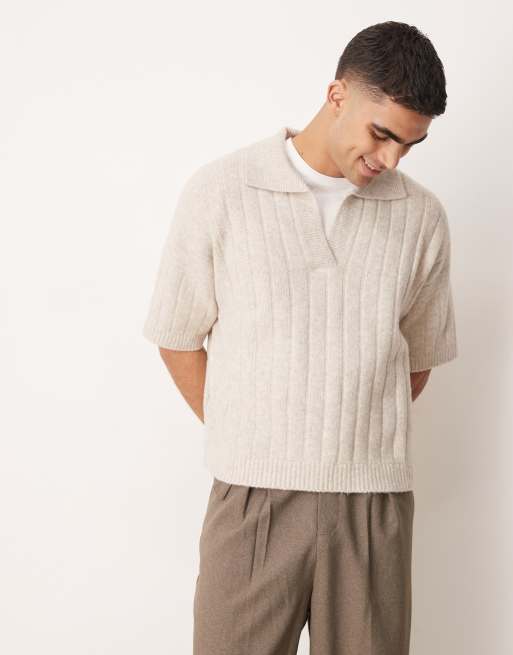 ASOS DESIGN - Oversized geribbelde polo met inkeping op de hals in ecru