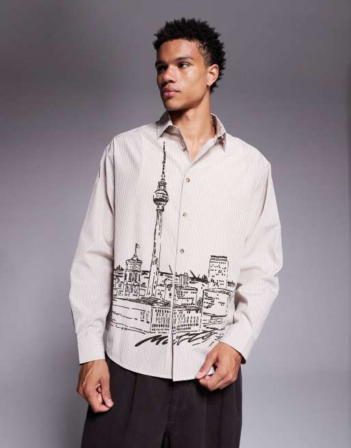 ASOS DESIGN - Oversized gestreept overhemd met landschap-print in beige