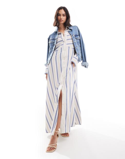 ASOS DESIGN - Oversized gestreepte maxi overhemdjurk met dubbele punt in de taille in stone en blauw