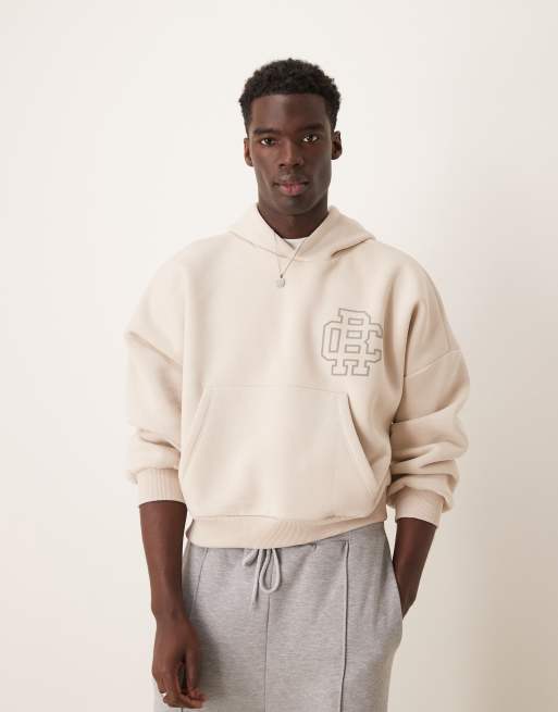 ASOS DESIGN - Oversized hoodie met verlaagde schouders en college print op de borst in gemêleerd havermout