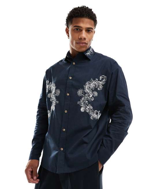 ASOS DESIGN - Oversized overhemd in jaren 90 stijl met bloemenborduursels in marineblauw