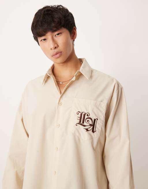 ASOS DESIGN - Oversized overhemd met borduursel op de borst in beige