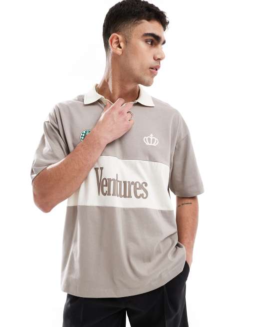 ASOS DESIGN - Oversized polo met gestikte vlakken en tekstprint in bruin