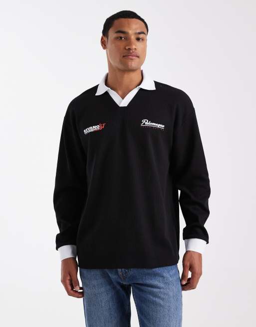 ASOS DESIGN - Oversized polo van zware stof met lange mouwen, tekstprint en wafeltextuur in zwart