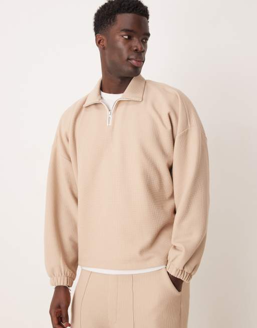 ASOS DESIGN - Oversized polotrui met verlaagde schouders van wafelstof met geborstelde achterkant in beige, deel van co-ord set