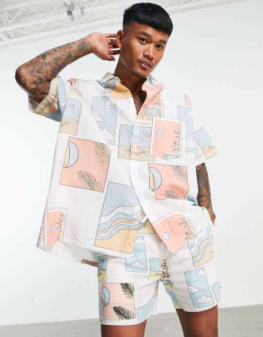 ASOS DESIGN - Oversized recht overhemd van linnenmix met ansichtkaartenprint, deel van co-ord set