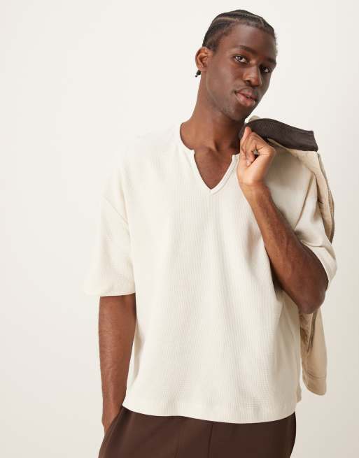 ASOS DESIGN - Oversized recht T-shirt met inkeping aan de hals en wafelstructuur in crème