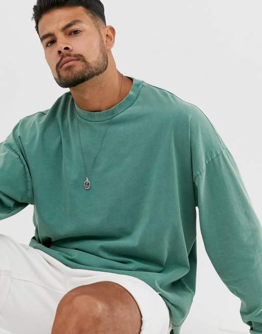 ASOS DESIGN - Oversized recht T-shirt met lange mouwen in groen met acid wash