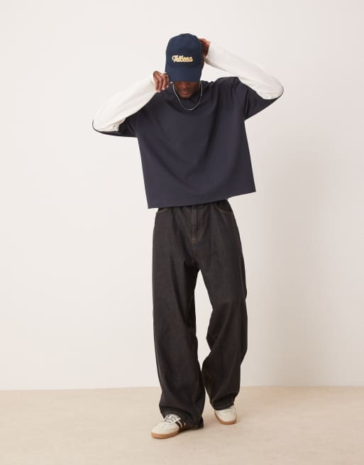 ASOS DESIGN - Oversized recht T-shirt van zware stof met lange mouwen met dubbele laag in marineblauw