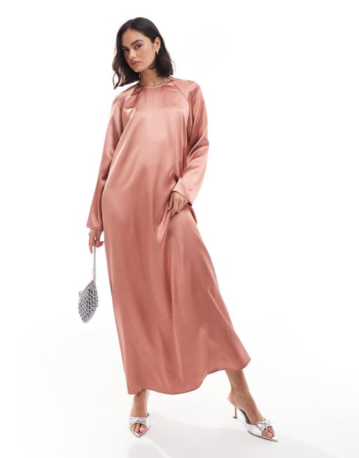 ASOS DESIGN - Oversized satijnen maxi jurk met ronde hals in donker beigeroze