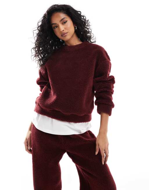 ASOS DESIGN - Oversized sweatshirt van borg in bordeauxrood, deel van co-ord set