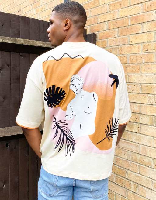 ASOS DESIGN - Oversized T-shirt met dubbele hals, borstzak en standbeeld print achterop