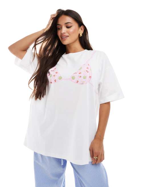 ASOS DESIGN - Oversized T-shirt met fruitbikiniprint in wit