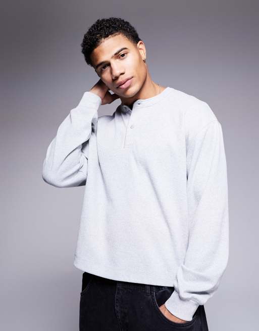 ASOS DESIGN - Oversized T-shirt met lange mouwen, wafeltextuur en henley-hals in antracietgrijs