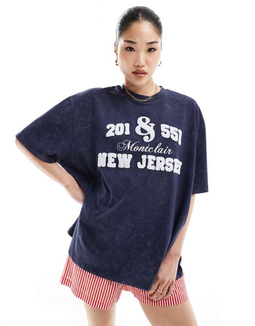 ASOS DESIGN - Oversized T-shirt met 'New Jersey' print van chenille in blauwgrijs
