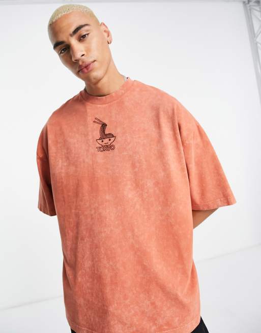 ASOS DESIGN - Oversized T-shirt van zware stof met borduursel van ramen in oranje wassing