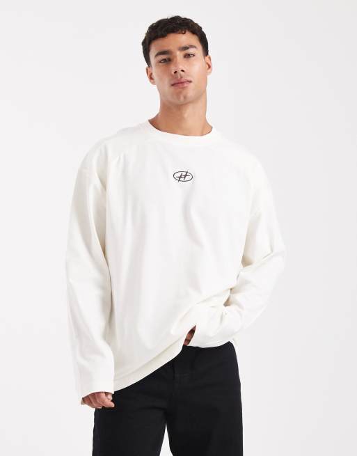 ASOS DESIGN - Oversized T-shirt van zware stof met lange mouwen, bedrukt embleem op de borst en gestikte details in crème