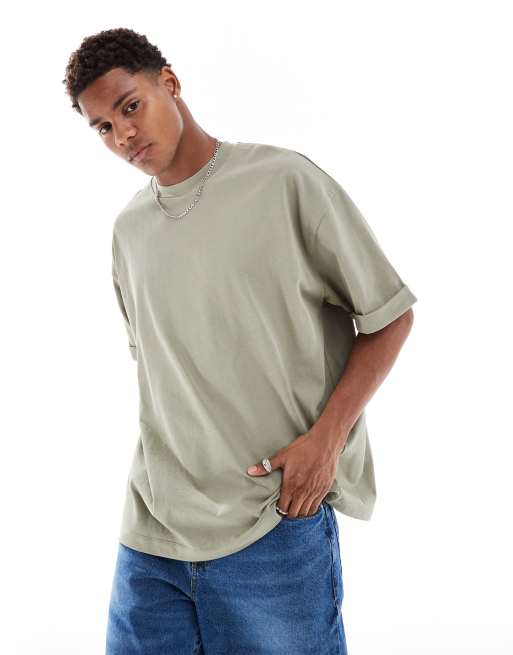 ASOS DESIGN - Oversized T-shirt van zware stof met opgerolde mouwen in kaki