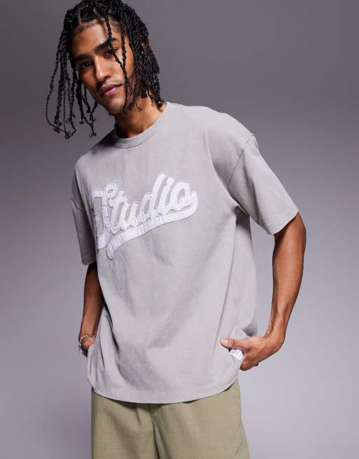 ASOS DESIGN - Oversized T-shirt van zware stof met zak en applicatie op de borst in grijs met wassing