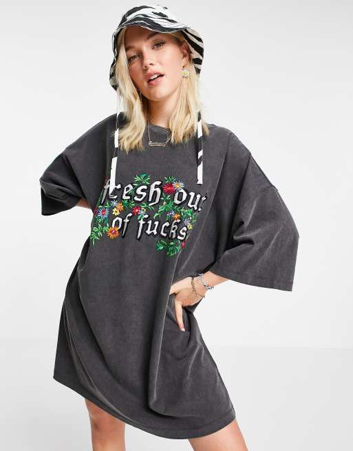 ASOS DESIGN - Oversized t-shirtjurk met 'Fresh Out of F--ks'-tekstprint in grijs met acid wash