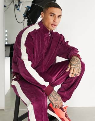 ASOS DESIGN - Oversized trainingsjack van geribbeld velour in bordeaux met bies langs de zijkant, deel van co-ord set