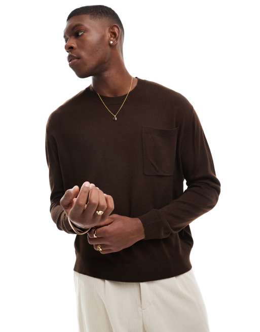 ASOS DESIGN - Oversized trui met ronde hals, rechte pasvorm en zak voor in bruin
