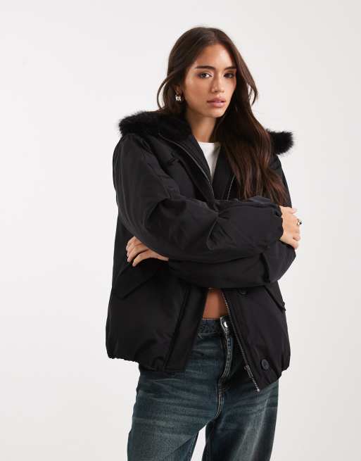 ASOS DESIGN - Parka-bomberjack met capuchon van imitatiebont in zwart