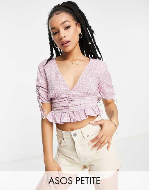 ASOS DESIGN Petite - Nette gerimpelde blouse met bloemenprint, V-hals en taille met peplum in lila