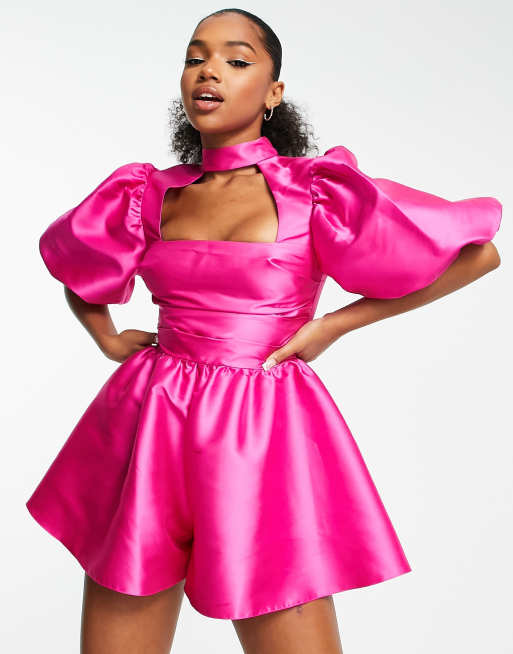 ASOS DESIGN - Playsuit van taft met pofmouwen en uitsnijding in felroze