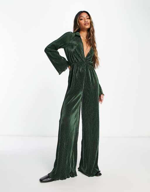 ASOS DESIGN - Plissé jumpsuit met lange mouwen in kaki