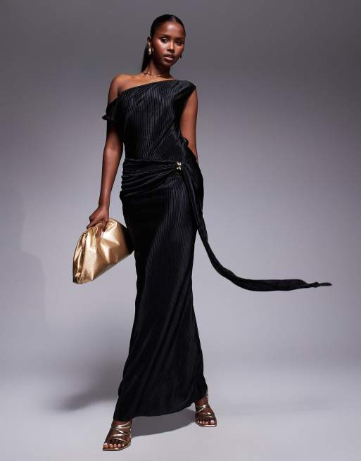 ASOS DESIGN - Plissé maxi-jurk met gedraaide afhangende schouder en gerimpeld gedrapeerd detail in zwart