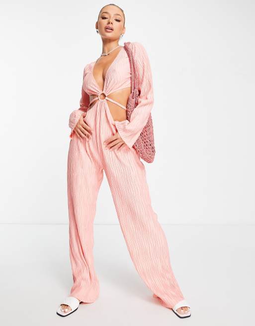ASOS DESIGN - Plissé strandjumpsuit met uitsnijdingen in koraal