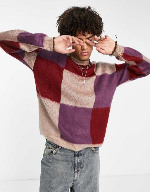 ASOS DESIGN - Pluizig gebreide trui met dambordmotief in bordeauxrood en beige