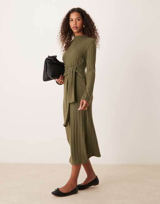 ASOS DESIGN - Pluizige midi jurk met brede ribbels en taille met overslag in kaki