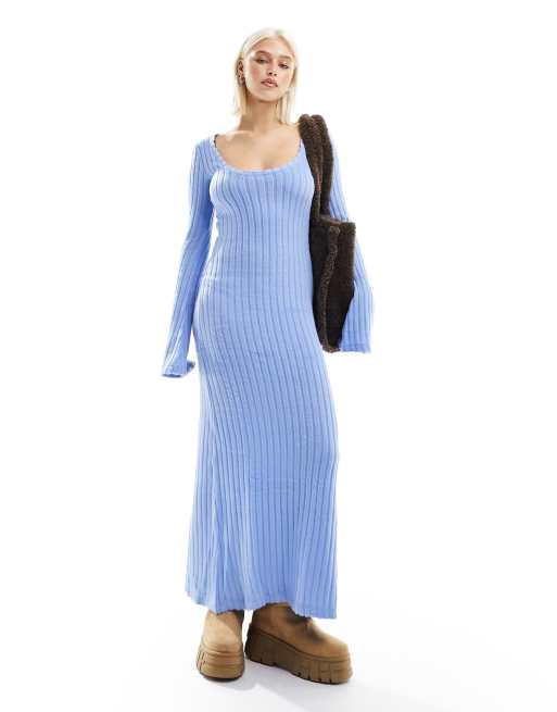 ASOS DESIGN - Pluizige midi-jurk met lage ronde hals en uitlopende mouwen in blauw