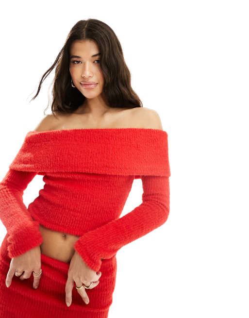 ASOS DESIGN - Pluizige top met omgeslagen bardot-halslijn in rood, deel van co-ord set