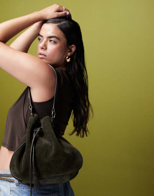 ASOS DESIGN - Premium buckettas met schouderband en kwastjes van suède in groen